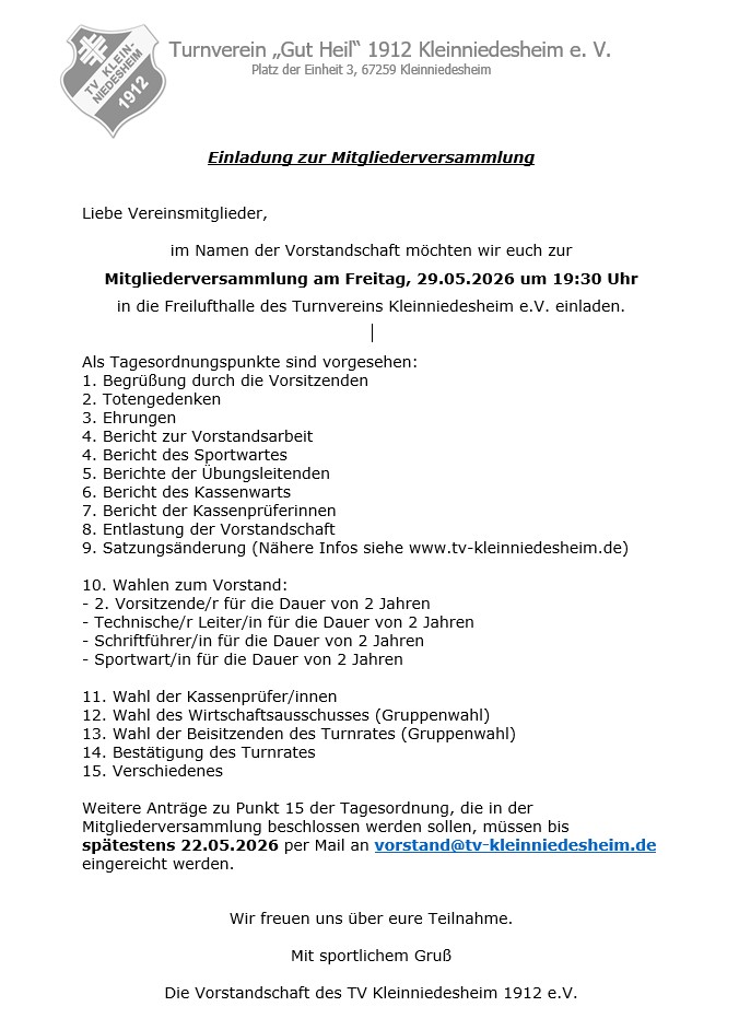 Der TV Kleinniedesheim bittet seine Mitglieder am 25. April 2026 ab 9:00 um Hilfe bei der Vorbereitung des Sportplatzes für sie Sommersaison, d