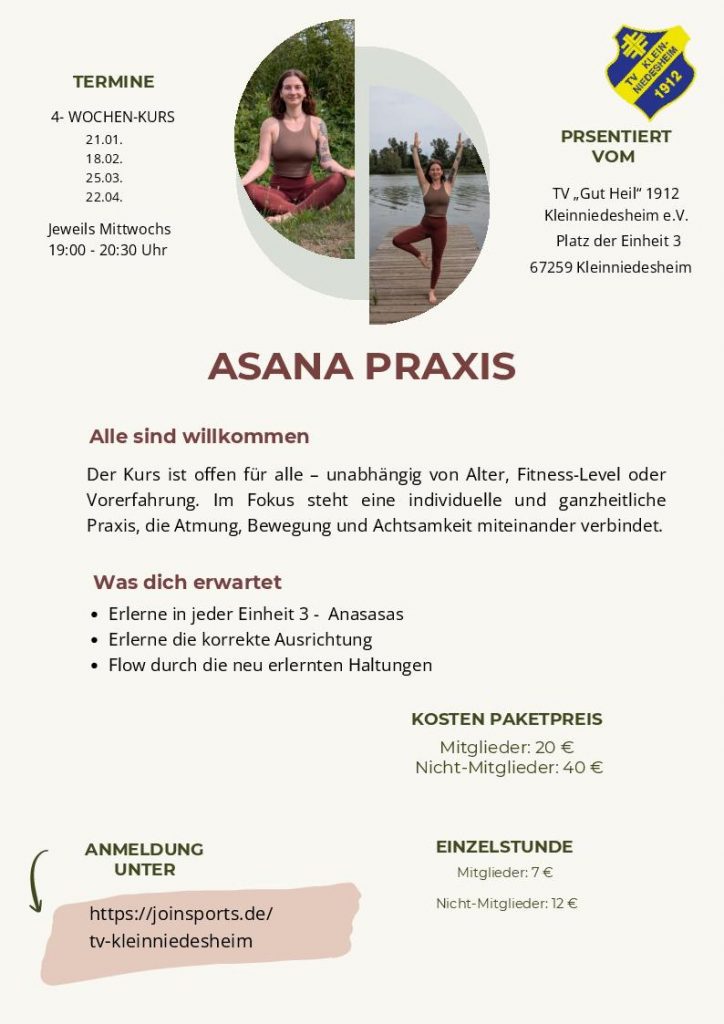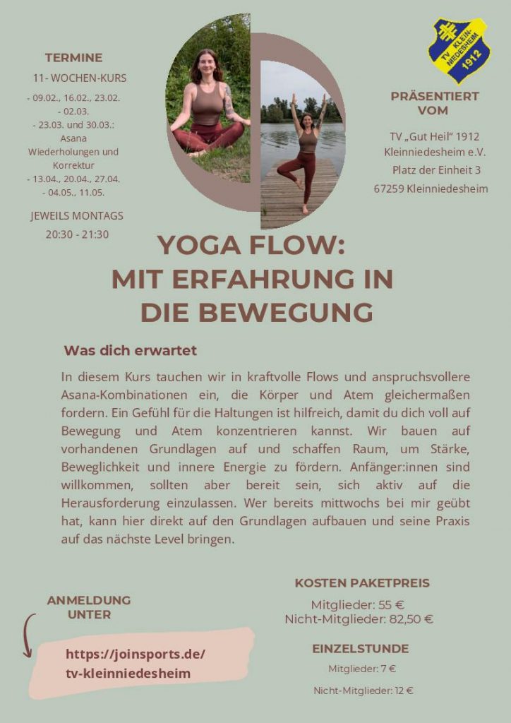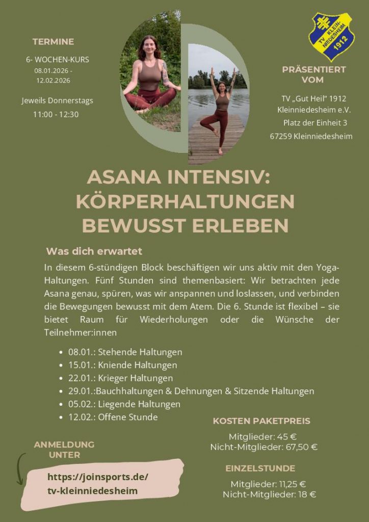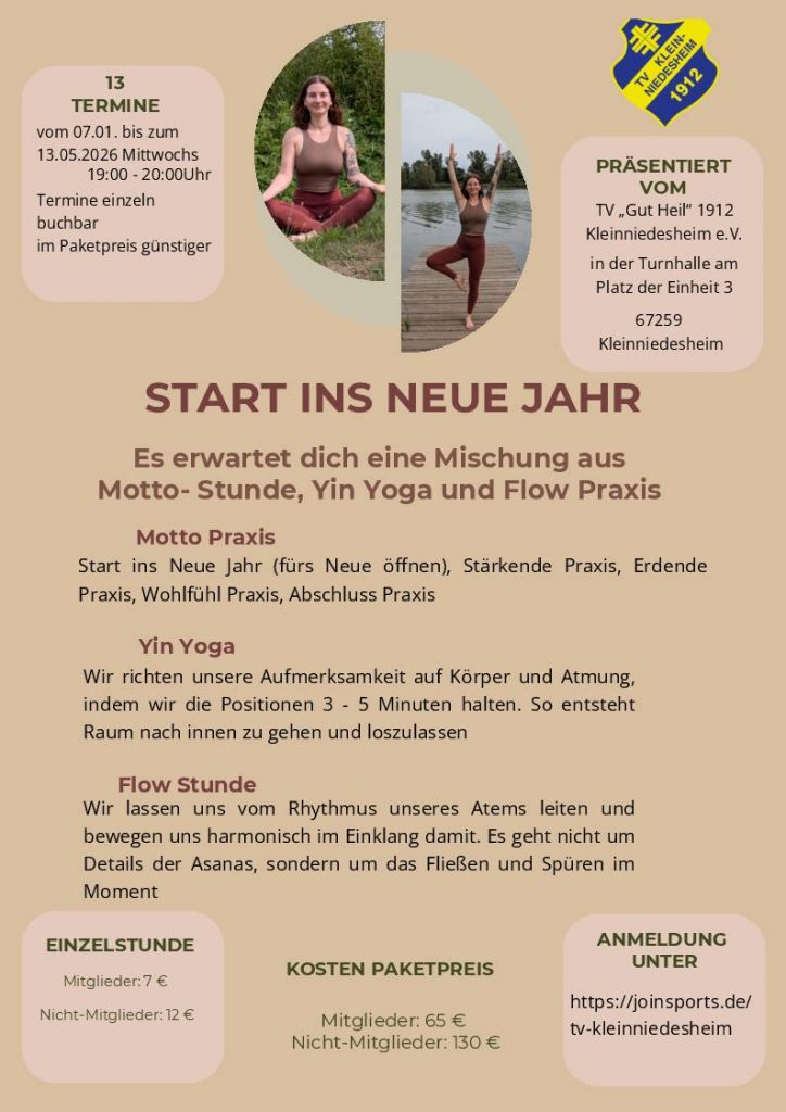 Eine Teilnahme an den Kursen ist für Nichtmitglieder nur nach Anmeldung unter https://joinsports.de/tv-kleinniedesheim möglich. Dort finden Interessierte auch weitere Details zum Kursangebot des TV Kleinniedesheim.